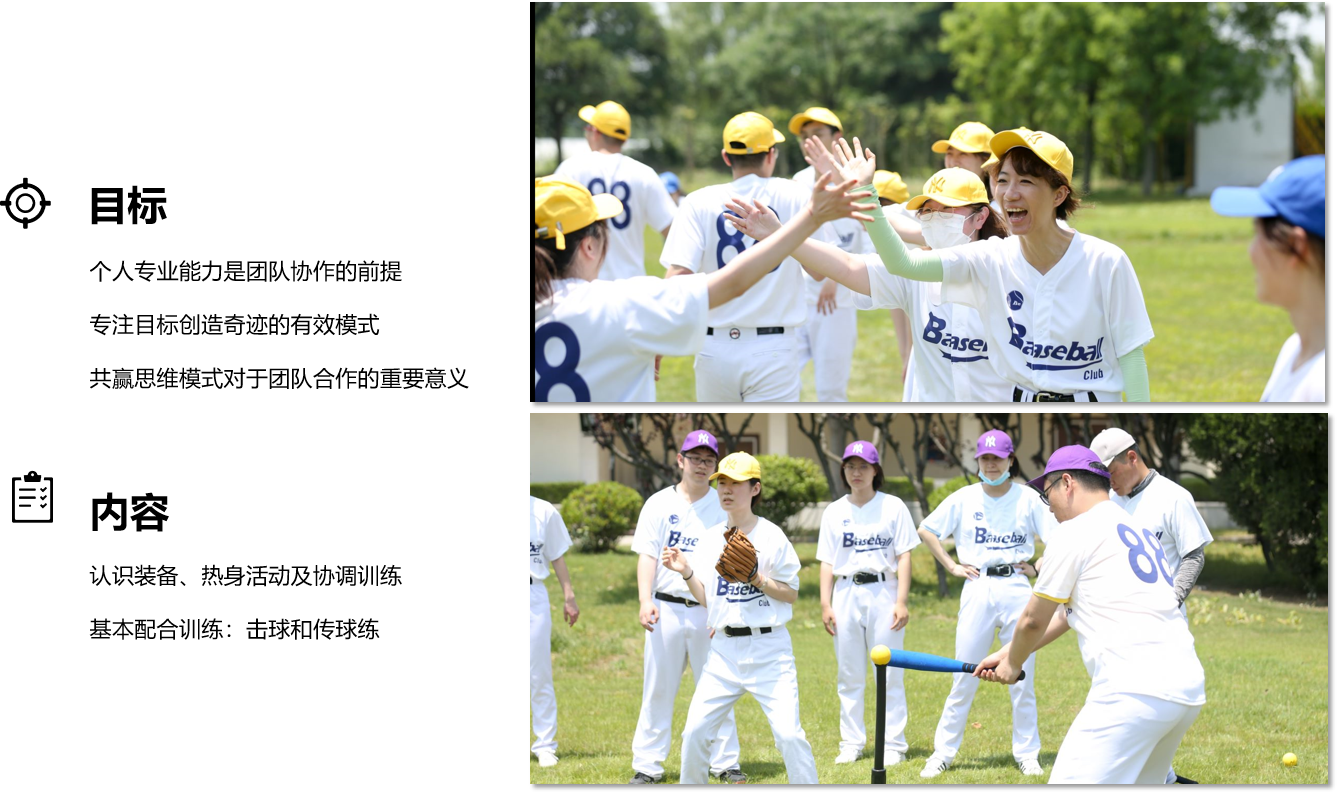 主题团建|超燃棒球发表时间:2025-07-19 15:38 棒球介绍: 作为多个国家的国球,棒球的魅力最大的特点还是因为他的团队精神。与足球篮球不同,足球可以靠一个人射门得分,篮球可以靠一个人投篮得分,而棒球则需要有人打击,有人跑垒,有人牺牲来获得分数。在棒球中,个人能力的强弱根本微不足道,只有相信队友和配合无间才能最终获胜,每一分都承载着全队的努力。而且棒球不倚靠体能,男女老少皆可在一个球场竞技,发挥各自的作用。棒球规则上手简单,四个字就能概括,投、打、跑、接。我们将根据职业棒球赛场氛围进行搭建,全套职业棒球球服及配置,让我们感受一场真正的棒球大联盟比赛。