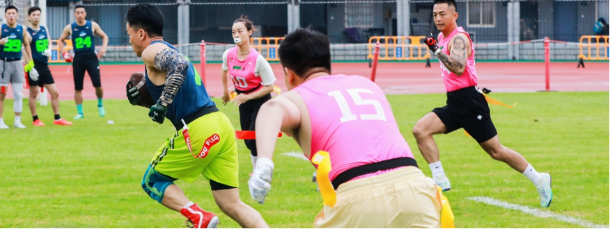 腰旗橄榄球因为无激烈身体对抗、规则简单,非常适合和无运动基础人群参与, 逐渐成为目前社群交友、企业团建、亲子互动的首选项目之一。