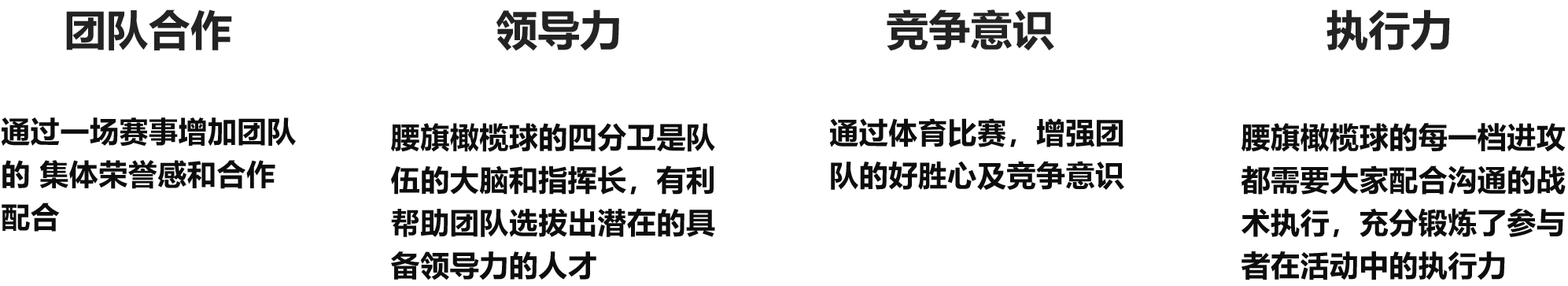 腰旗橄榄球的意义: 腰旗橄榄球可以理解为一项集战术,策略,个人能力与团队配合为一体的 “抢地盘”之战。在腰旗橄榄球中,每个人都是赛场上的主角,但是每人 扮演的角色不同。唯有团结一心,才能获得比赛胜利。