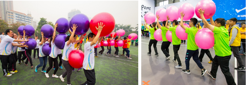 小组所有人站成一路纵队,将瑜伽球放于前后两人之间,彼此将瑜伽球夹紧,并且每人双手需要手持一颗瑜伽球,利用最快的速度从起点到达终点,中途瑜伽球不可脱落;